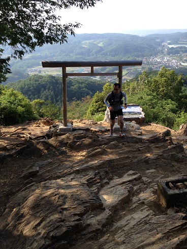 そこそこな角度の登りのトレイル走り始めて数十分。良い感じに身体が温まってきたところで日和田山山頂へ到着。山々に囲まれた日高市の街並みが一望できます。市街地からすぐのところにトレイルがあり、自然の豊かさを実感しながら北西へ進みます。