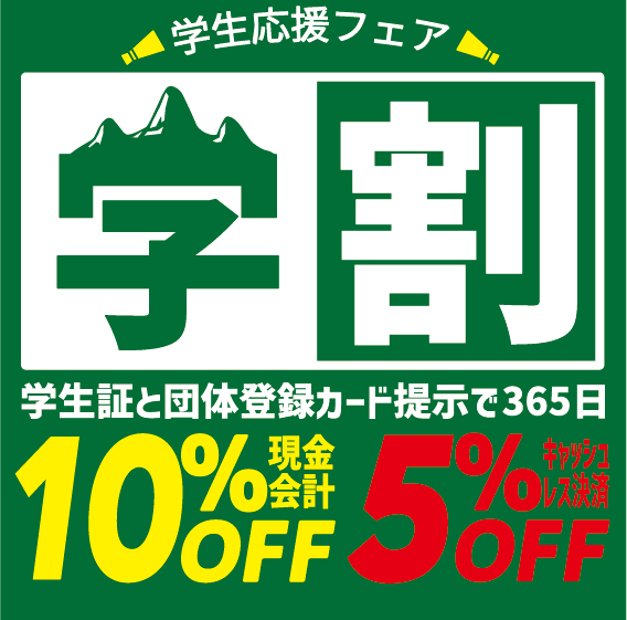 お会計時レジにて学生証と団体登録カードのご提示で現金会計10%割引き、キャッシュレス決済5%割引きさせていただきます。(対象外品有り)