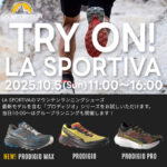 2025年9月17日 / 最終更新日時 : 2025年9月26日 staff クライミング 10/5開催「グルランも!”TRY ON! LA SPORTIVA” スポルティバのマウンテンランニングシューズ試し履き会」のお知らせ LA SPORTIVA(スポルティバ)のマウンテンランニングシューズ、最新モデルを含む「プロディジオ」シリーズをお試しいただけます。当日10:00~はグループランニングも開催します! イベント名称 TRY ON! LA […]